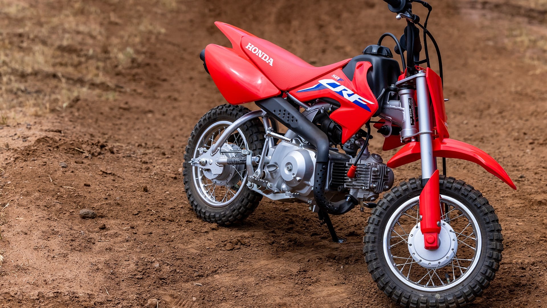 Den mindste model i CRF-F serien med 10 tommer hjul for og bag, 3 gear med automatisk (slyng) kobling, lav sædehøjde og mulighed for justere gashåndtagets vandring og dermed farten. Et absolut hit hos de små, der har ”benzin” i blodet.